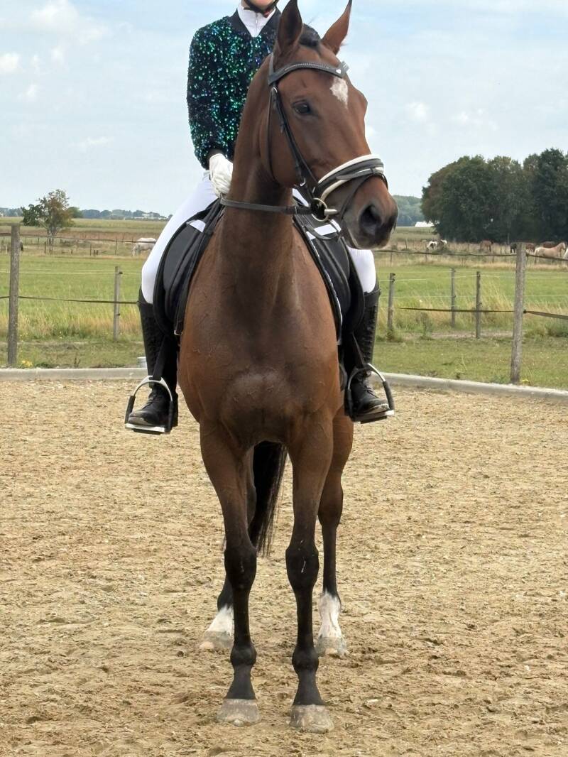 Deze bruine merrie is 6 jaar oud.(geboren 2016) Toen ze bij ons kwam had ze enkele keren voor de wagen gelopen en hij was goed zadelmak. Inmiddels heeft ze al heel veel geleerd en heeft ze afgelopen juli haar eerste wedstrijd gelopen. Dit deed ze heel braaf. Bruni is braaf te rijden, maar moet nog wel verder opgeleid worden. Ze loopt een nette dressuurproef, maakt al een leuke sprong en vind mee op buitenrit gaan ook leuk.